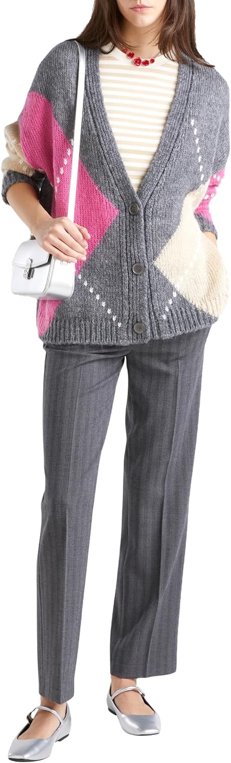 Cardigan à plusieurs fils de mélange Mohair coupe boxy, épaule tombée, finition satinée avec motif Maxy losange sur le devant et les manches, filet incrusté même sur le dos, finition en côte